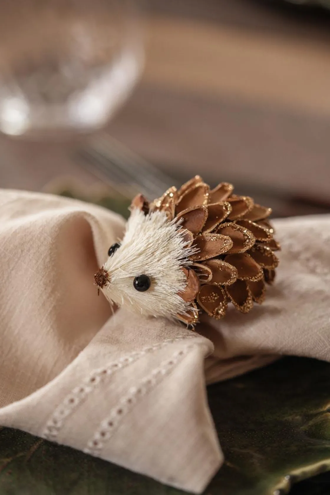 Tre små pinnsvin er klare for å flytte inn og spre høststemning. Med detaljer i naturmaterialer og et dryss av glitter sniker de seg lett inn på hyller eller som pynt på et dekt middagsbord.