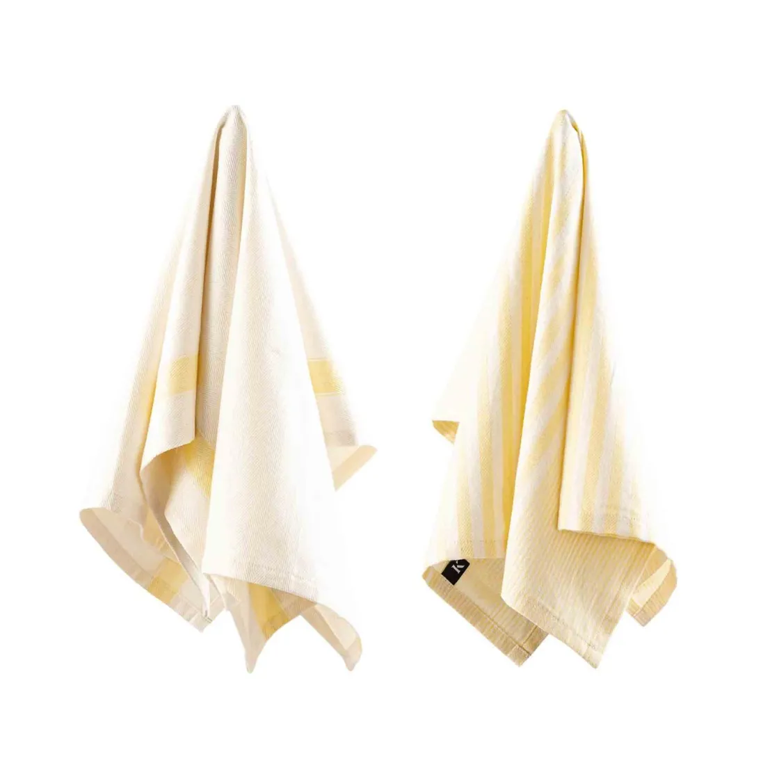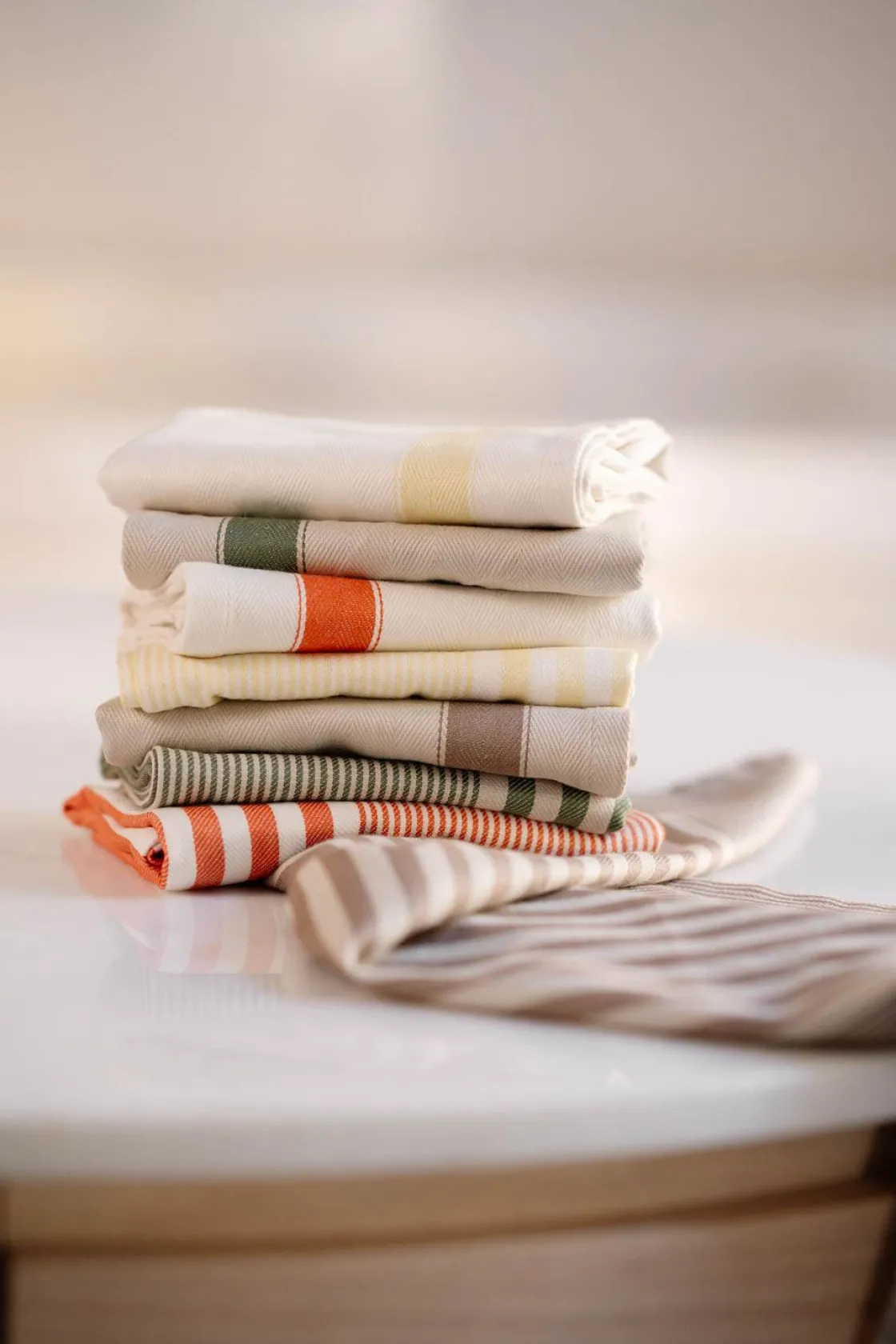 To kjøkkenhåndklær i et harmonisk design med delikate striper og ensfargede detaljer. Perfekt for å gi kjøkkenet et løft samtidig som de er praktiske i bruk. Kombiner med matchende spisebrikker eller løpere for et gjennomført uttrykk ved middagsbordet.