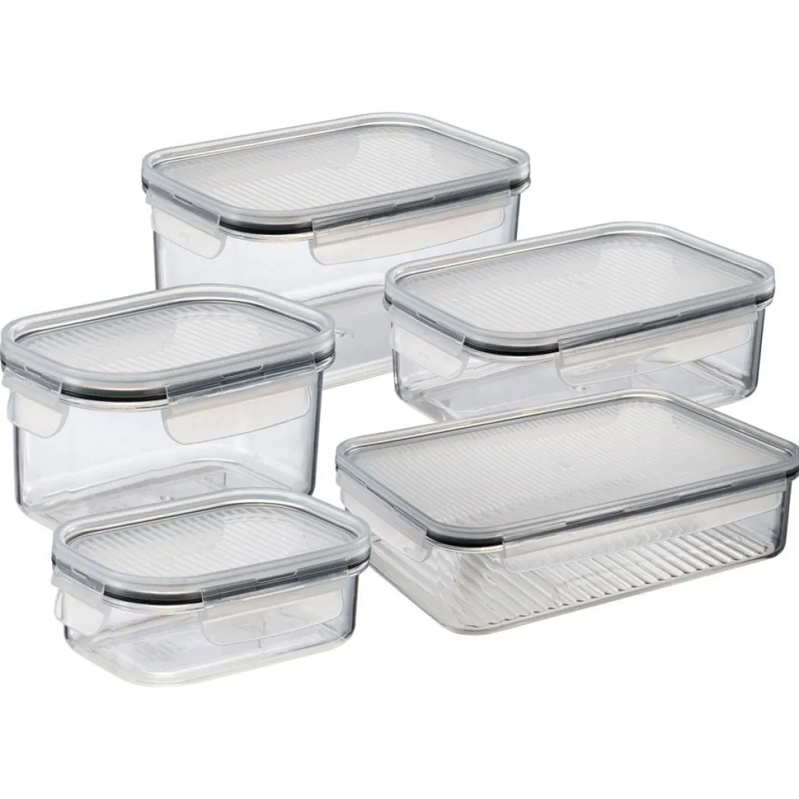 Oppbevar maten trygt og friskt med vårt nydelige Locknlock oppbevaringsbokssett fra Modern House! Dette sjarmerende settet består av 5 lufttette og gjennomsiktige bokser i ulike størrelser, perfekte for å holde orden i skapet, kjøleskapet og skuffene dine. Laget av holdbar Tritan® plast, sikrer disse boksene både lang levetid og klarhet. Med lufttette lokk som sørger for å bevare matens friskhet, er de både praktiske og funksjonelle. Og ikke minst, de er enkle å rengjøre i oppvaskmaskinen og tåler både mikrobølgeovn og fryser. Så nå kan du glede deg over frisk mat og organisering!