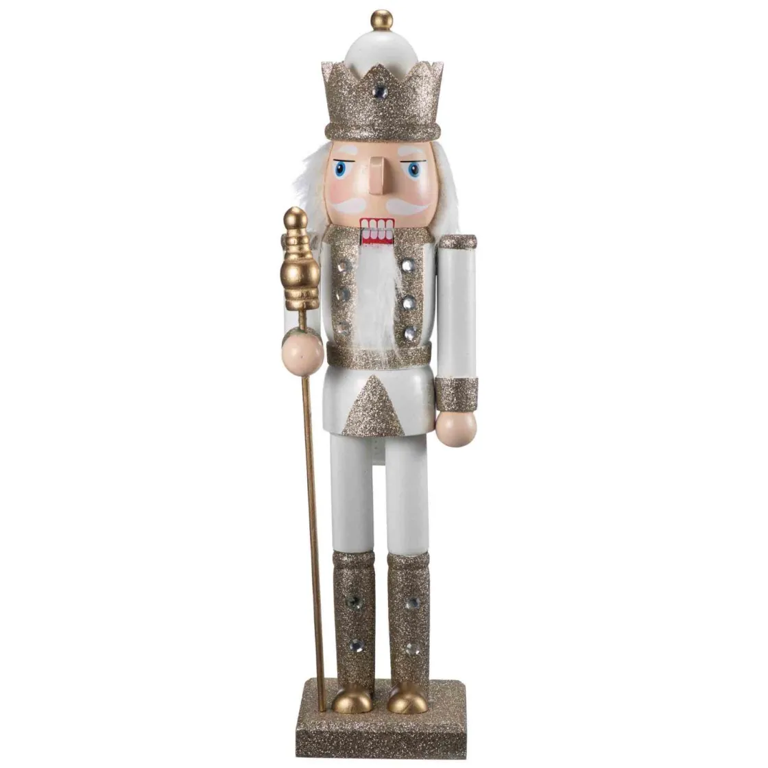 En hvit nøtteknekker med detaljer i glitterende gull gir en elegant touch til julepynten. Dent stilige designet gjør den til et vakkert midtpunkt på enhver festlig oppdekking.