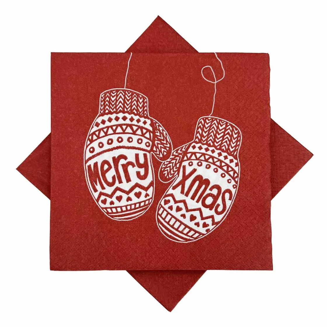 Disse røde serviettene har et morsomt design med to julevotter og teksten «Merry Xmas.» Perfekte til julens borddekking, de gir en hyggelig stemning til måltidet.