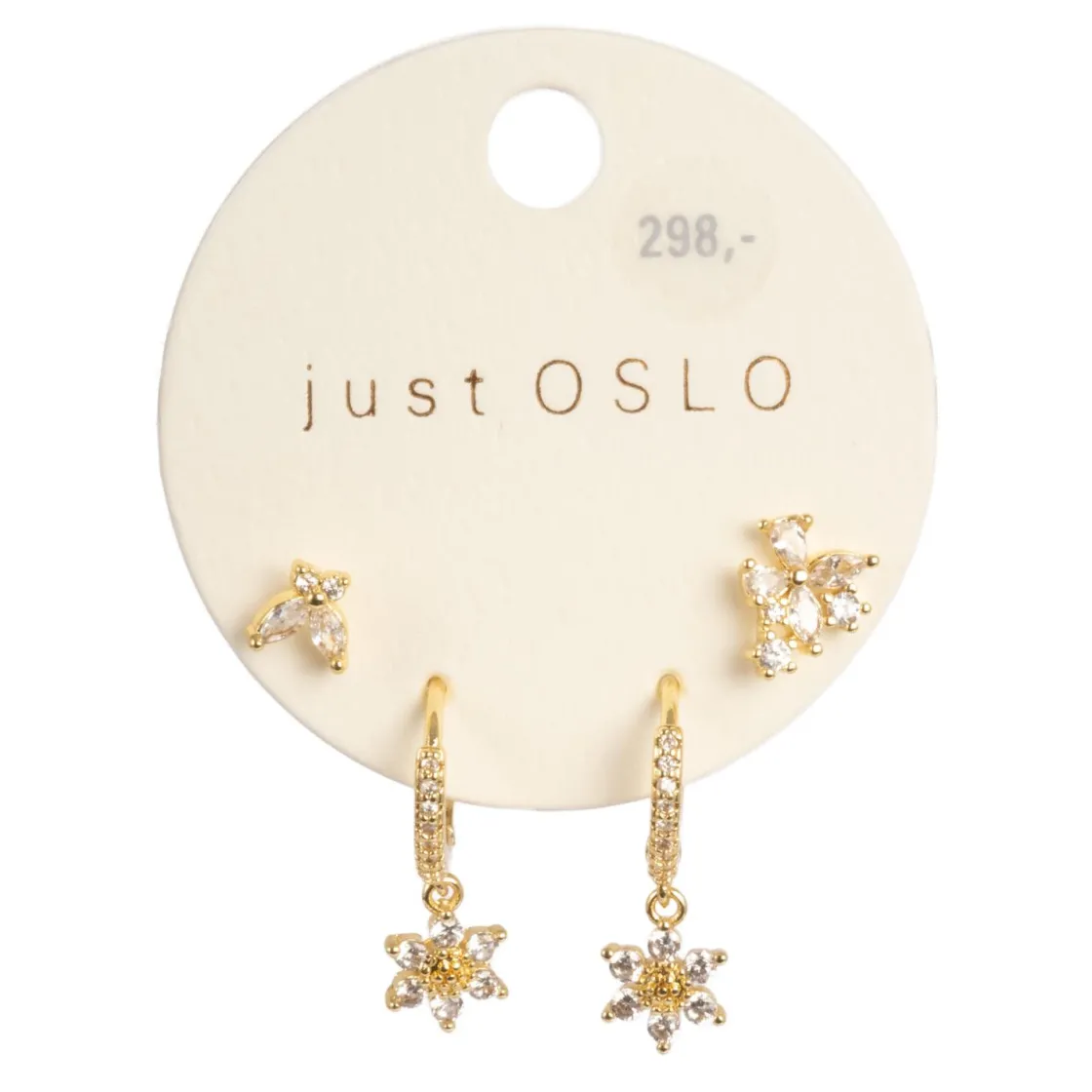 Sett med fire øredobber i gullfarget design, pyntet med delikate blomster. Perfekte for enhver anledning!