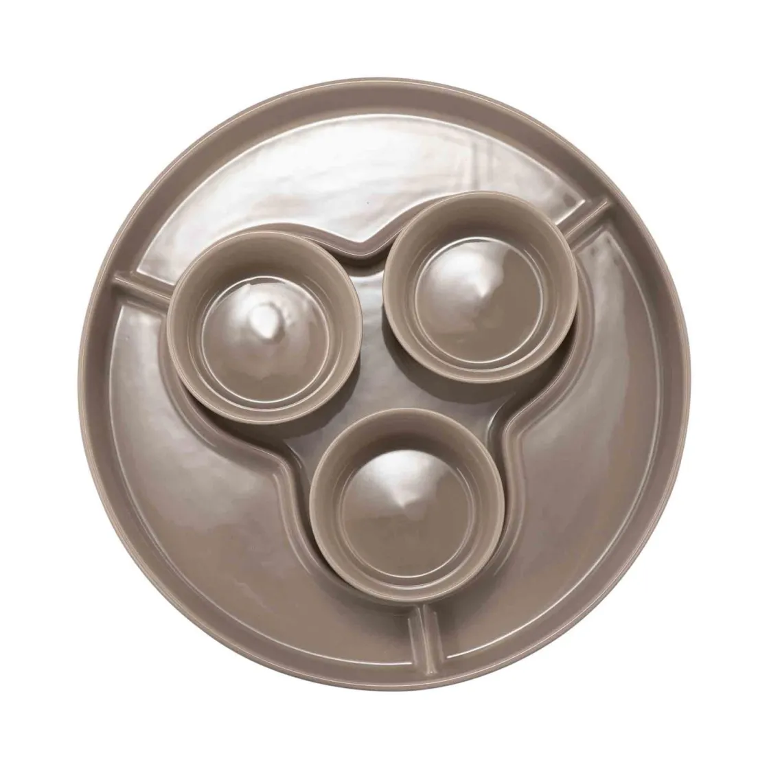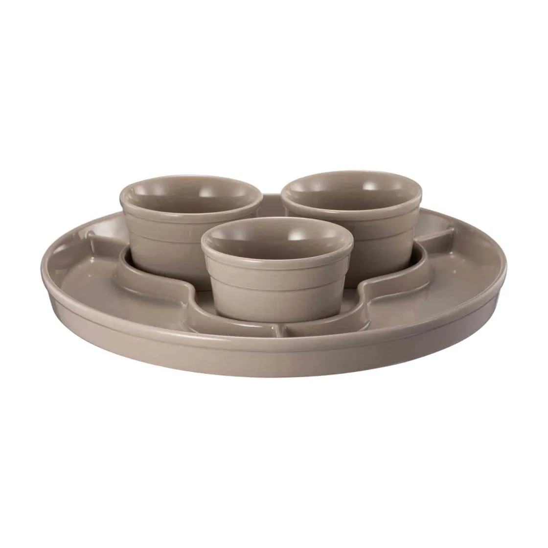 Praktiske og stilig tapasfat med tilhørende beige skåler, designet for å presentere et variert utvalg av småretter med eleganse og finesse.