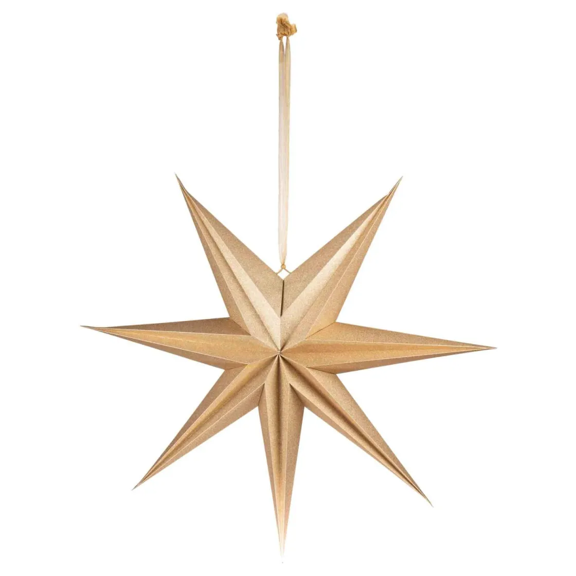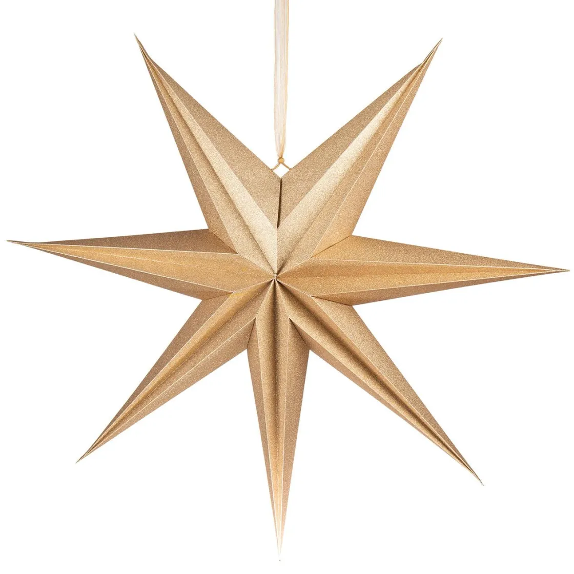 Adventsstjerne Gull 75 er en papirstjerne som passer fint i vinduet eller som aksent på døra. Julestjerna har en klassisk form, med syv kanter. Gullpapiret gjør at stjerna gir et flott lys, hvor enn du henger den.