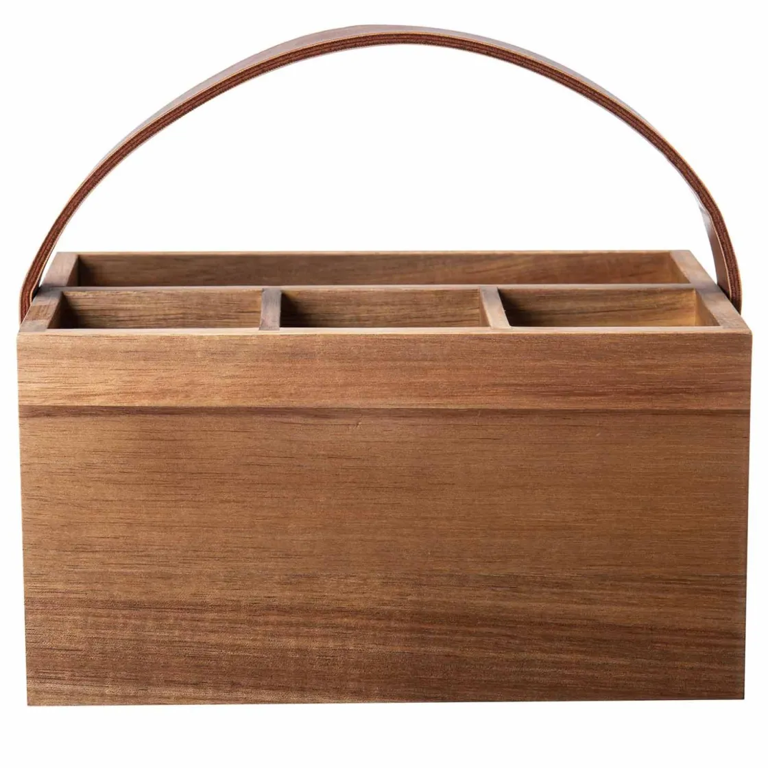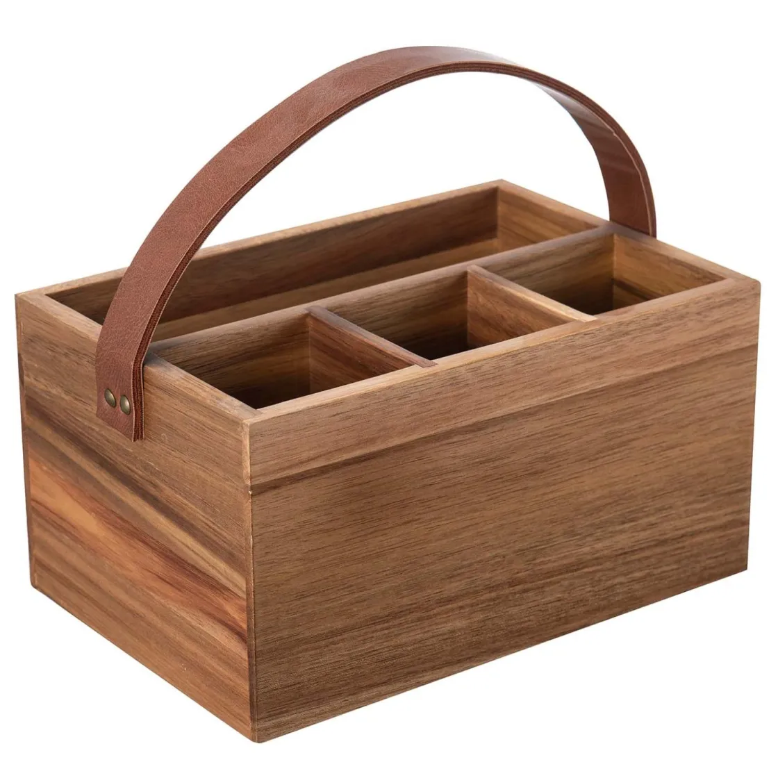 Tøff bestikkholder i akasietre med håndtak i skinn. Avdelt i 6 rom for plass til å dele etter ønske og behov. Supertøff å ha fremme på kjøkkenbenken.