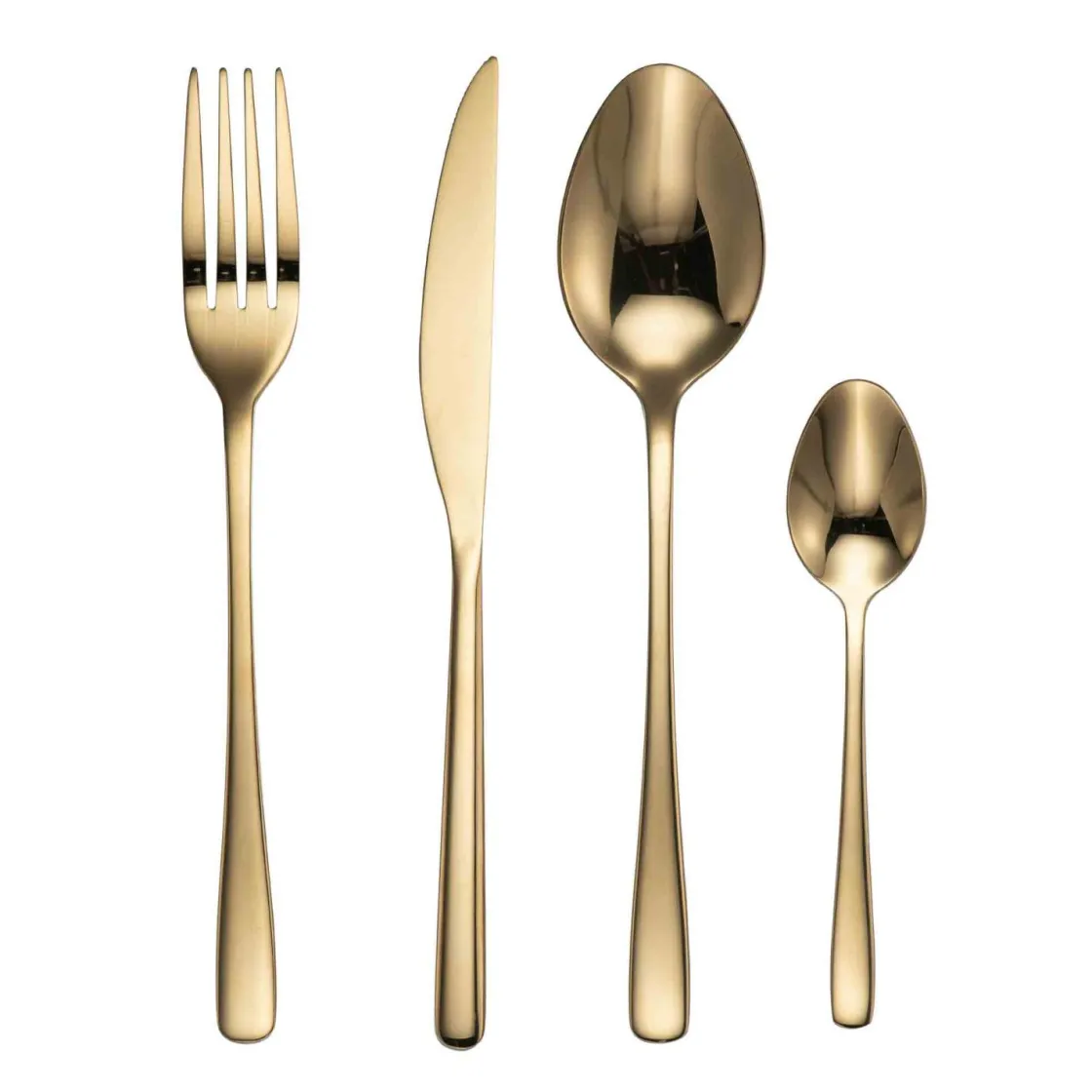 Nydelig, gullfarget bestikksett bestående av kniv, spiseskje, gaffel og teskje. Det elegante designet tar borddekkingen til nye høyder og passer likegod til hverdagsmiddagen som til fest.
