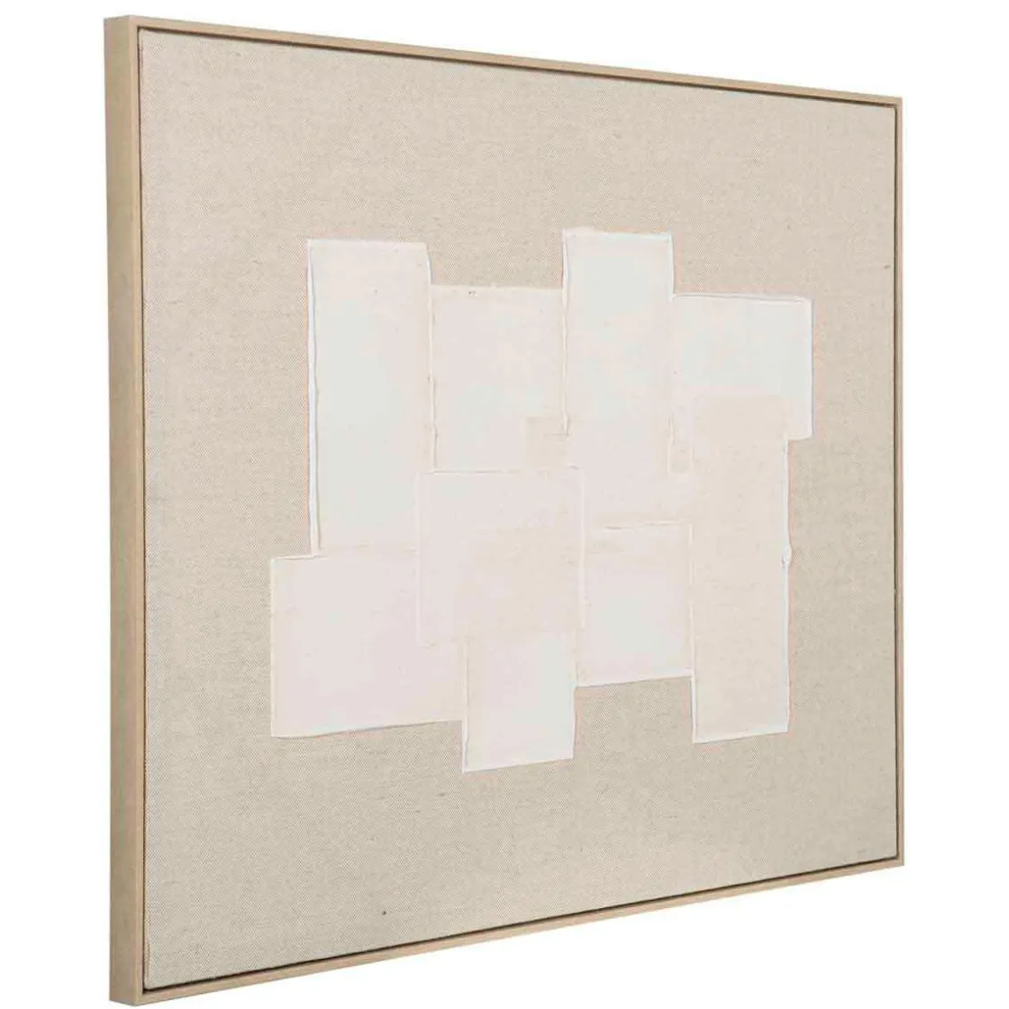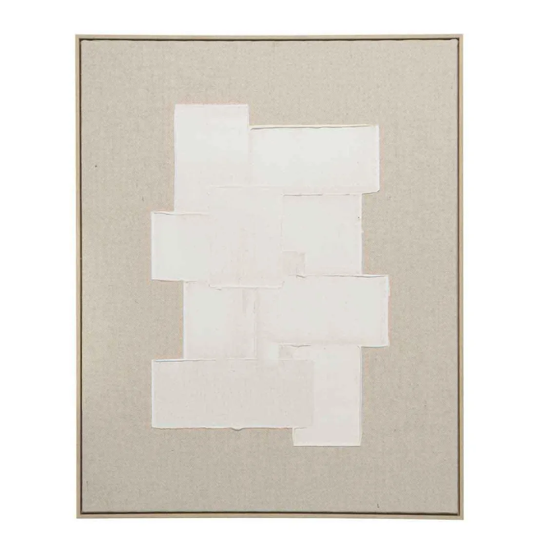Strukturerte flater møter naturfarget lerret i et stille samspill av form og tekstur. Et kunstverk som gir rommet en følelse av balanse. Passer like fint over en skjenk eller sengen som i en bildevegg i stua. Bilde kan henges både stående og liggende, så du tilpasser etter ønske.