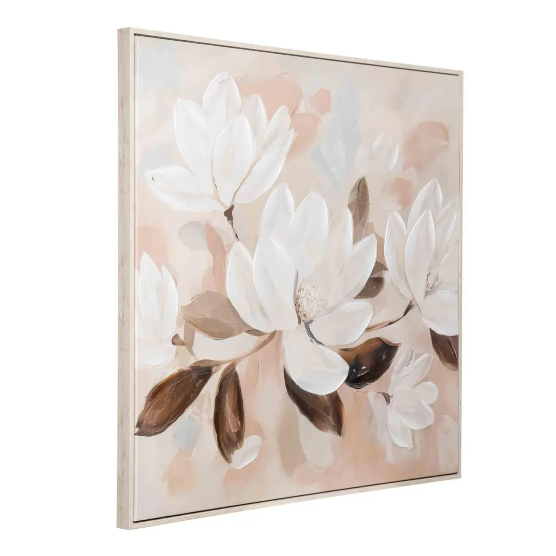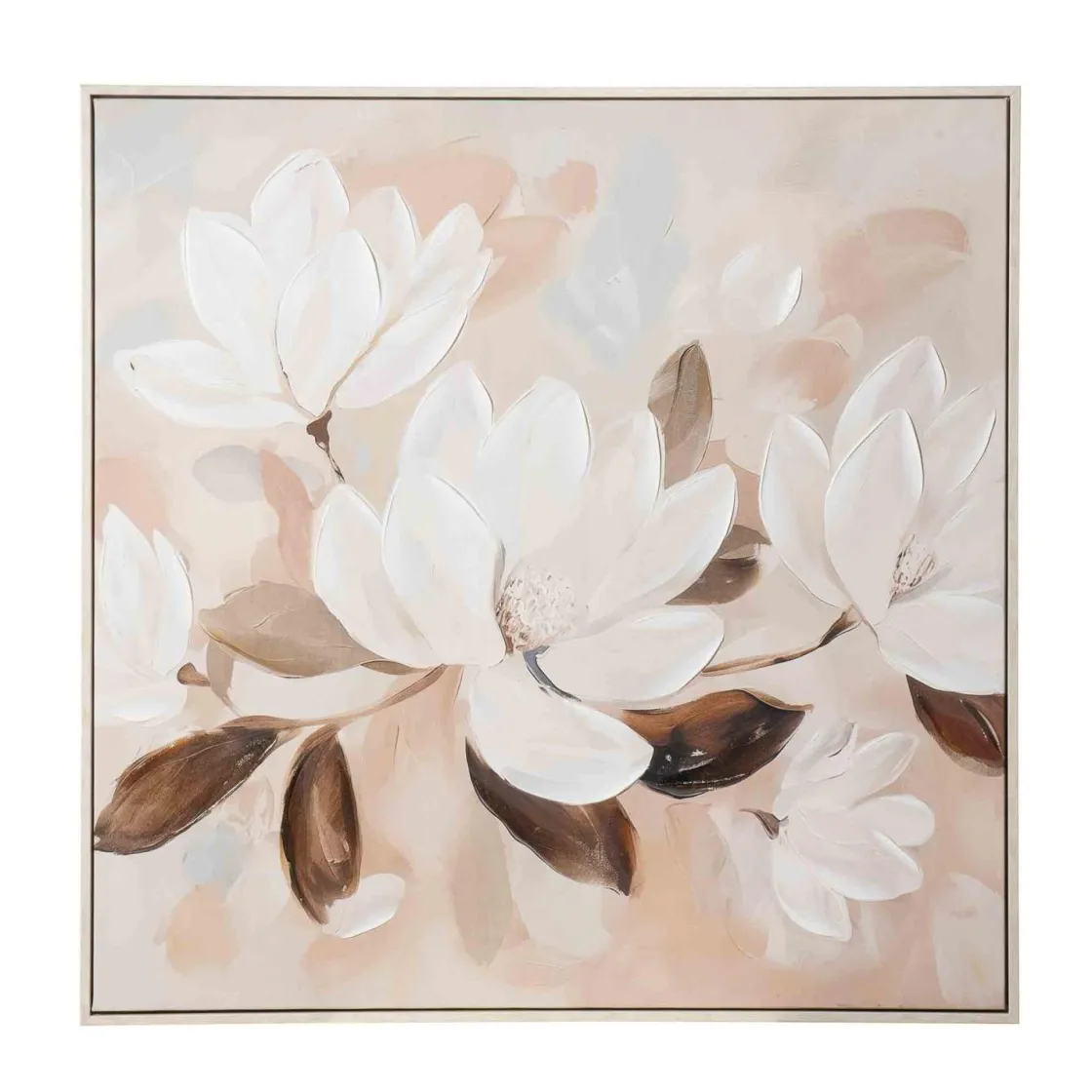 Et vakkert blikkfang med store blomster som flyter elegant i harmoniske nyanser. Maleriet skaper en lun stemning og passer perfekt i stuen, soverommet eller over spisebordet. Kombiner det med myke og i matchende toner for en helhetlig og koselig atmosfære. Et innrammet kunstverk som gir rommet karakter og gjør veggene levende.