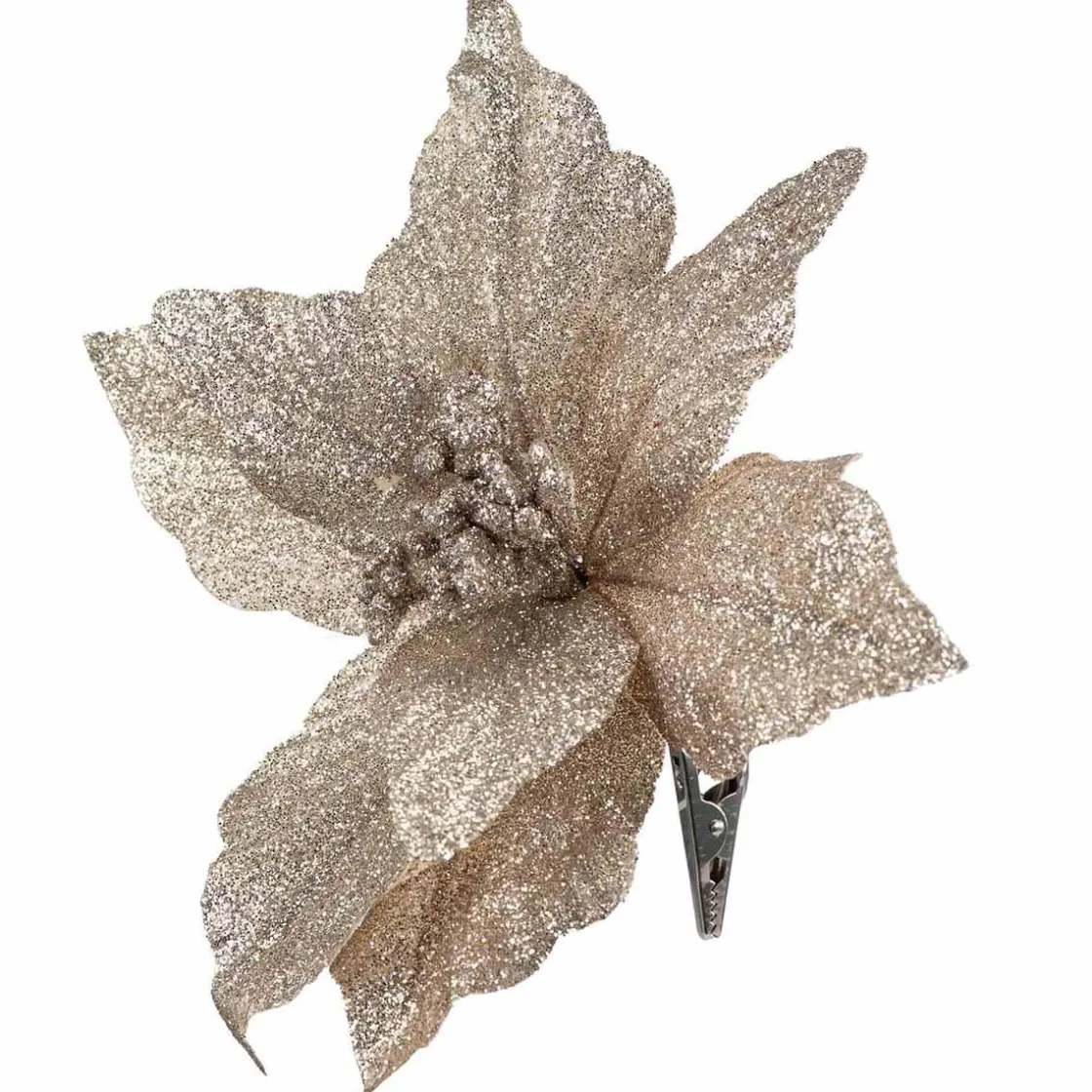 Dekorativ blomst med glitter og praktisk klype som gjør den enkel å feste der du ønsker. Perfekt til juletreet, en julekrans eller som bordpynt i julen.