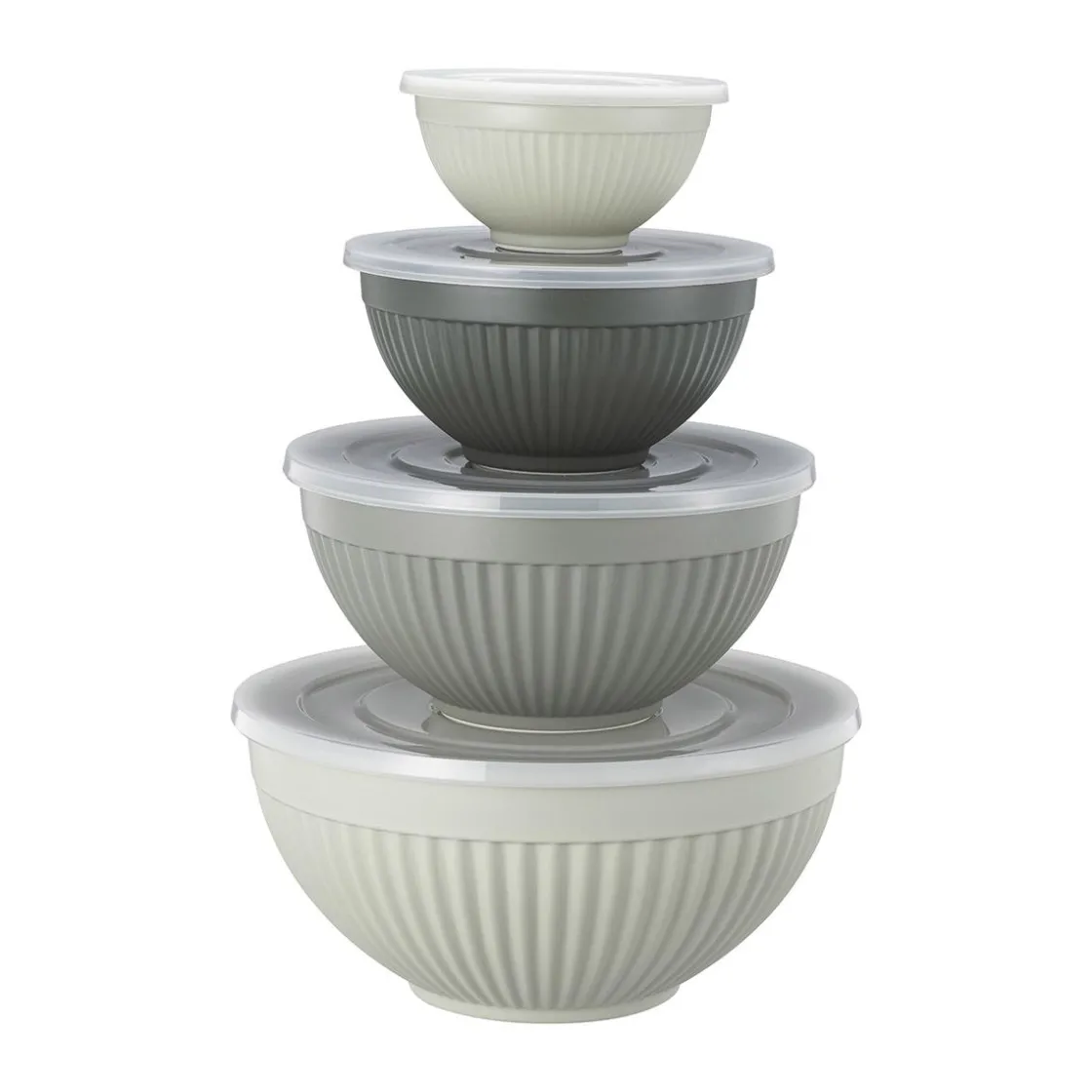 Dette praktiske bollesettet i melamin er perfekt til både matlaging, servering og oppbevaring. Settet består av fire boller i ulike størrelser, alle med tilhørende lokk. Bollene har en dekorativ rillet overflate og nøytrale farger som passer fint inn på kjøkkenet. De er lette, solide og enkle å rengjøre – ideelle til baking, salater eller rester. Et funksjonelt sett som gjør hverdagen på kjøkkenet litt enklere