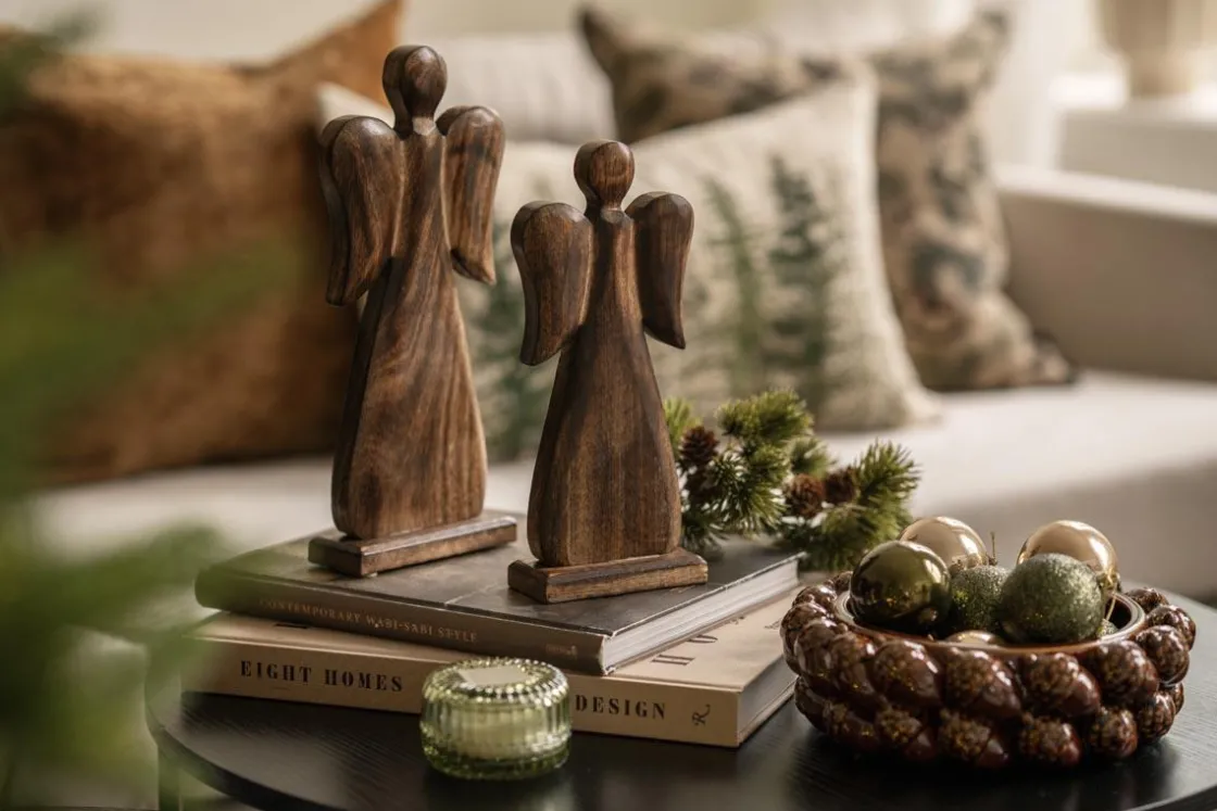 Denne vakre engelen i mangotre sprer en lun og fredfull stemning i hjemmet. Med sitt tidløse uttrykk passer den like fint på peishylla som på bordet. Utforsk også vårt for flere dekorative figurer som skaper stemning i høytiden. Kommer også i en