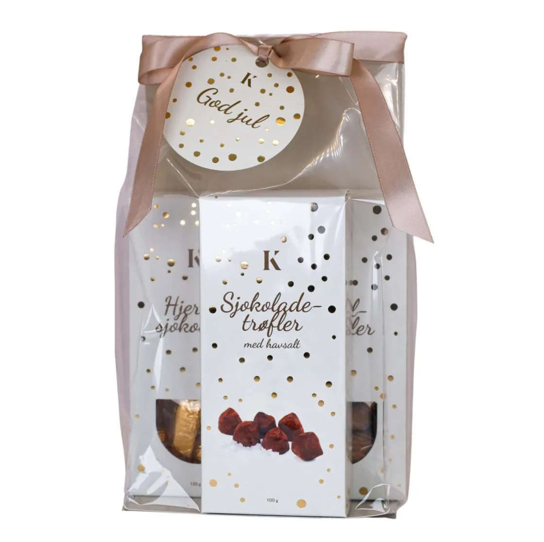 Denne gavepakken inneholder en smakfull kombinasjon av hjertesjokolade, kanelmandler og sjokoladetrøfler med havsalt. Alt er pakket i en stilfull og dekorativ gavepose med en flott sløyfe, klar til å gis bort til noen som fortjener noe ekstra godt til jul.