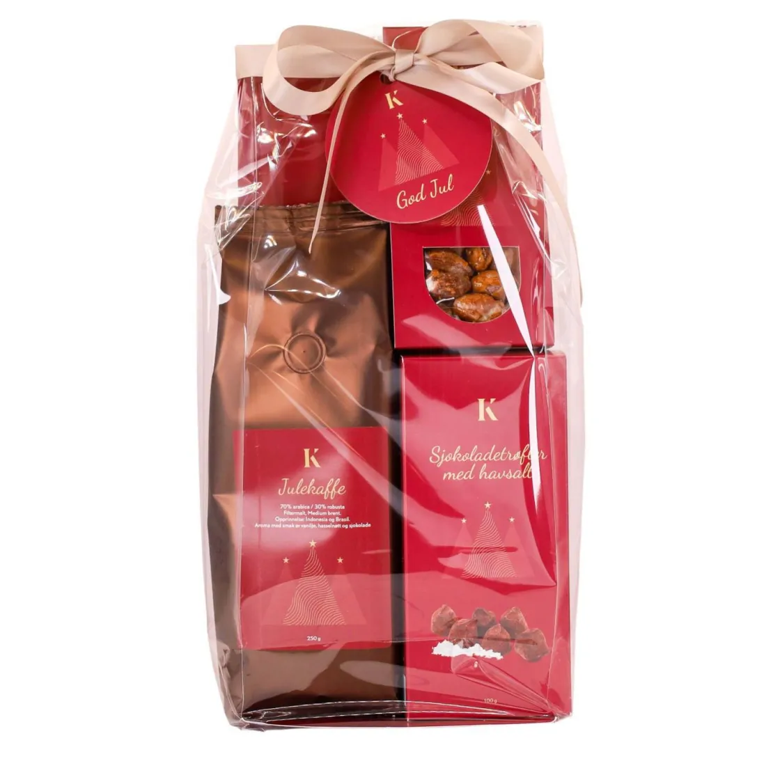 Denne gavepakken inneholder julekaffe, brente mandler og sjokoladetrøfler med havsalt, perfekt som en smakfull gave til noen du setter pris på. Julekaffen er en balansert blanding av arabica og robusta, med noter av vanilje, hasselnøtt og sjokolade. De brente mandlene gir en klassisk, søt crunch, mens sjokoladetrøflene med havsalt tilfører en fin kontrast mellom søtt og salt. Pakket inn med en dekorativ sløyfe, klar til å gis bort.