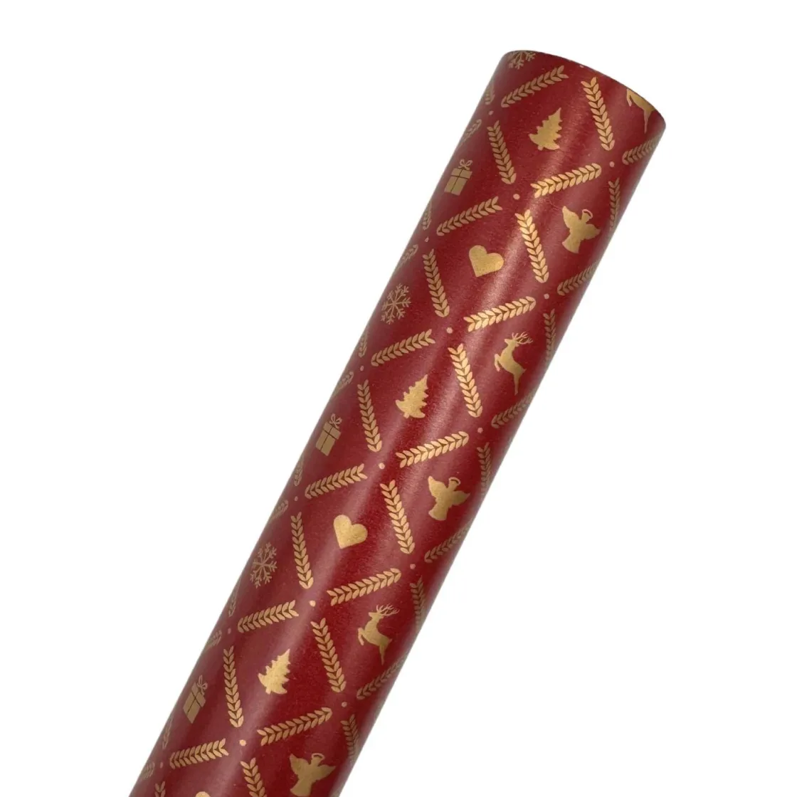 Dette gavepapiret i dyp rødfarge har et klassisk julemønster med gyldne julemotiver som hjerter, reinsdyr og snøfnugg. Papiret gir en varm og tradisjonell følelse til julegavene og passer fint til både store og små pakker. Med dette papiret kan julegavene få et koselig og personlig preg, perfekt for den tradisjonelle julestemningen under treet.