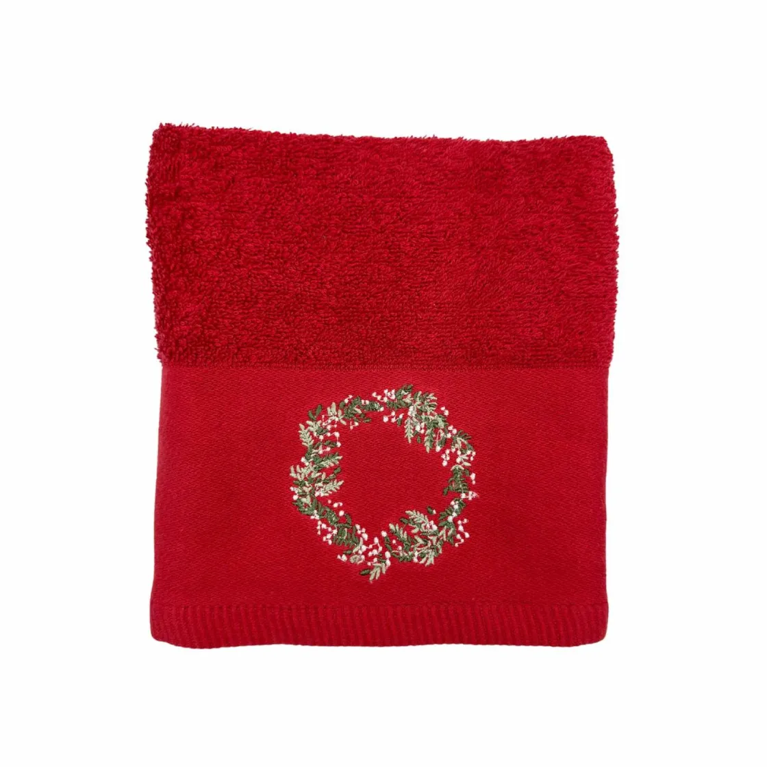 Dette røde håndkleet har en dekorativ krans brodert i enden, som gir et hint av julestemning til badet eller kjøkkenet. Laget av mykt materiale som gjør det behagelig å bruke til tørking av hender eller ansikt. Perfekt for å legge til et festlig preg i hjemmet i juletiden, eller som en hyggelig gave til noen du vil glede. Lett å vaske og vedlikeholde, slik at det kan brukes sesong etter sesong.