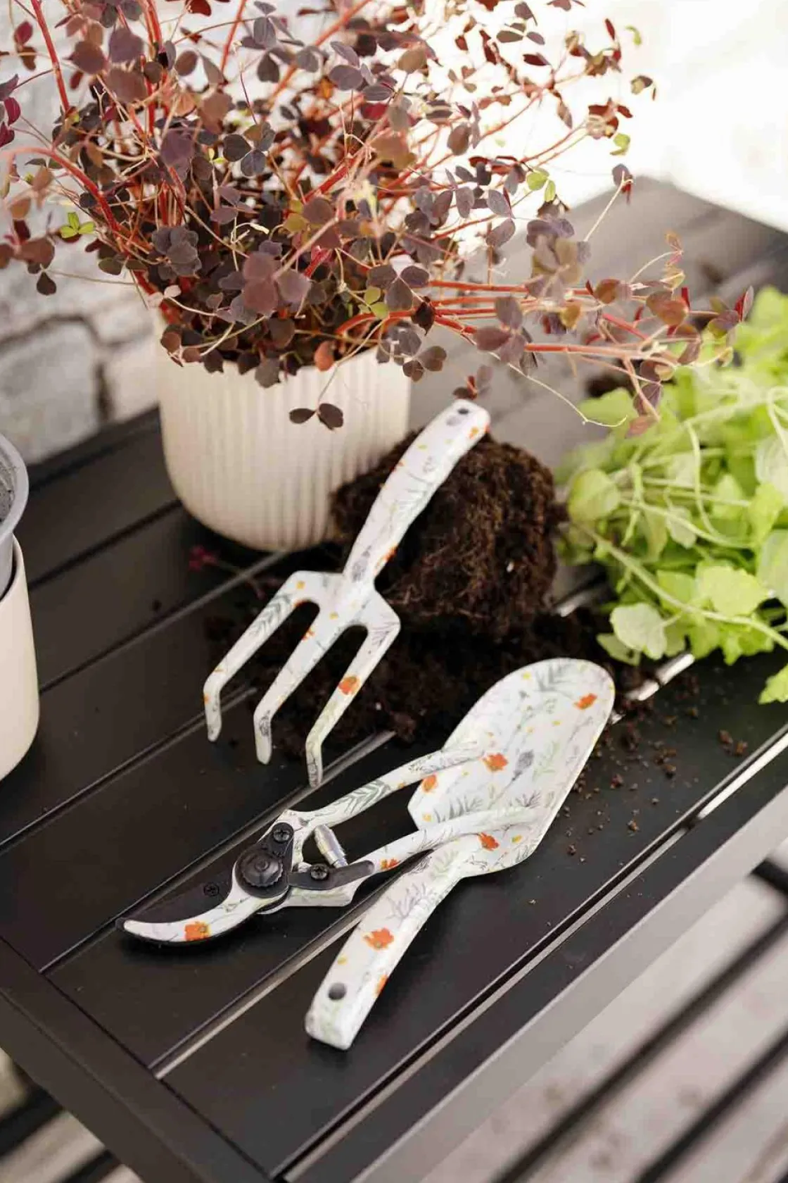 Hageredskapene du har ventet på! Med dette settet får du både spade, hagegaffel og beskjæringssakser, alt med en fin blomsterdesign som lyser opp hagearbeidet.