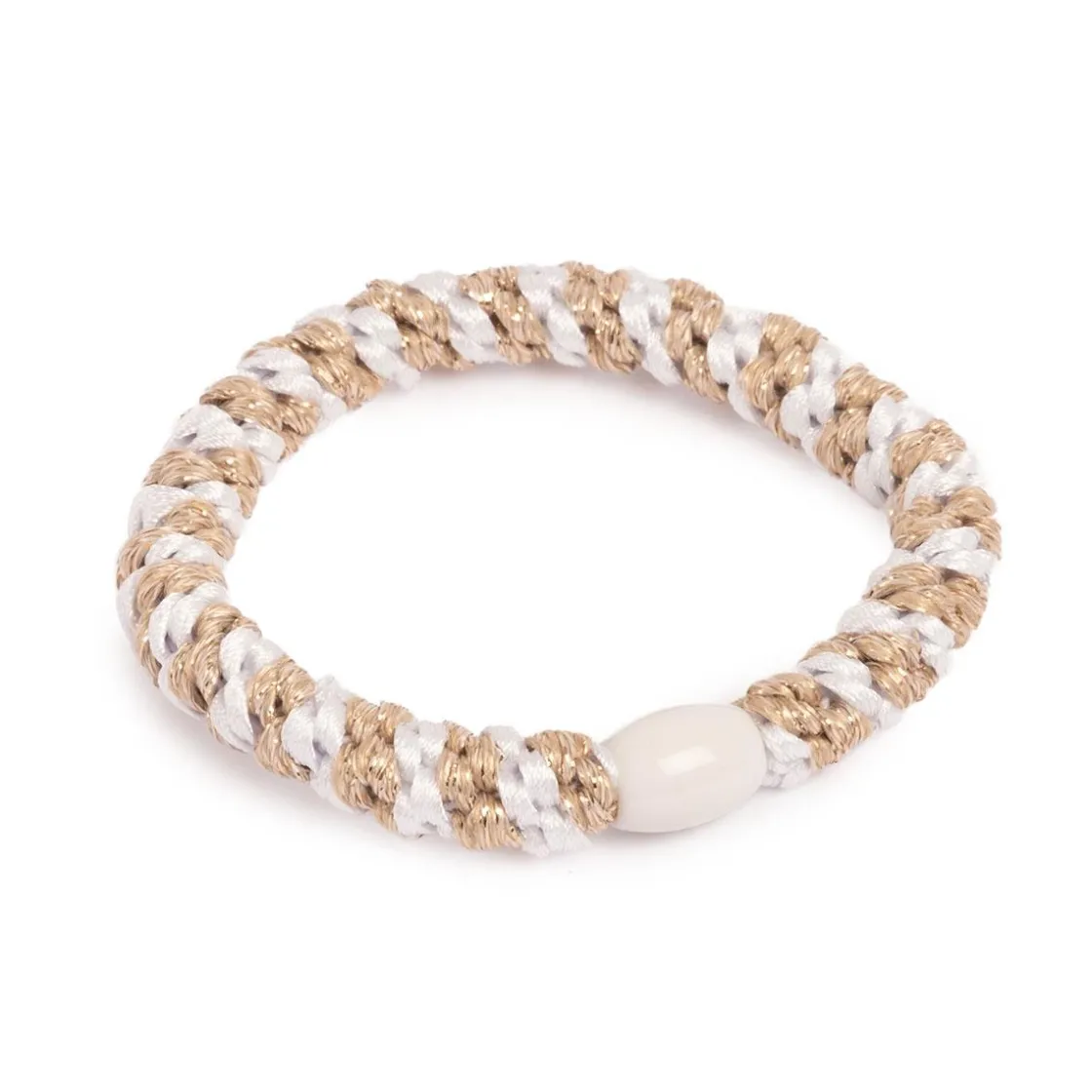 Hårstrikk med glitter i hvit og gull, en elegant og funksjonell detalj som gir både hold og et luksuriøst preg til håret ditt.