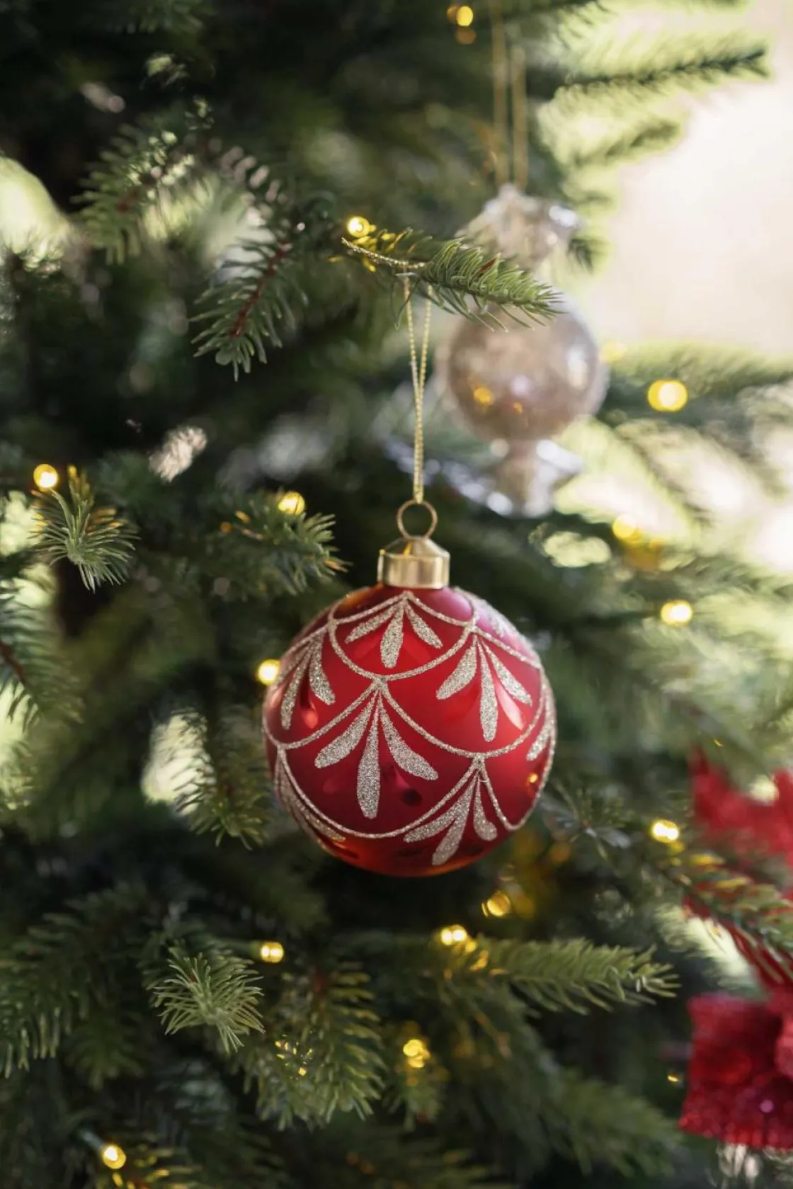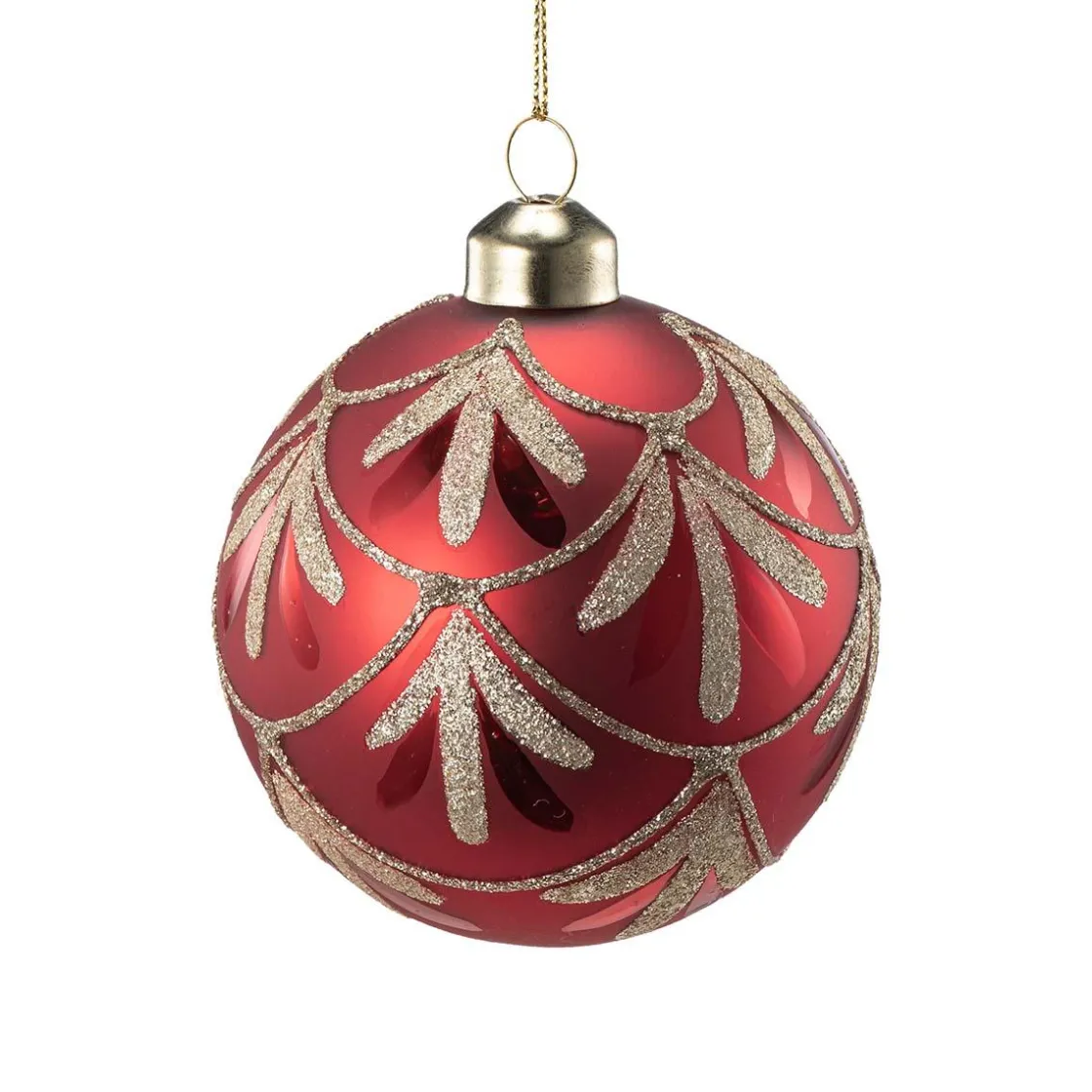 Skap magisk julestemning med vår røde julekule med glitrende gulldetaljer! Denne vakre julekula kombinerer den klassiske røde fargen med elegante gulldetaljer i glitter, og tilfører juletreet ditt en gnist av luksus og tradisjon.