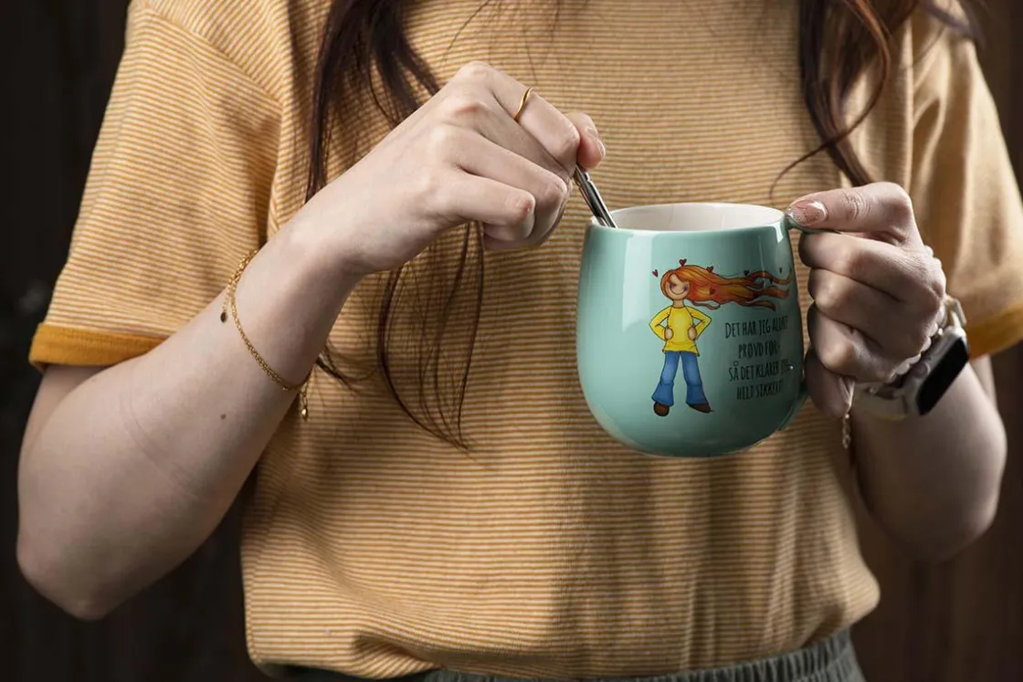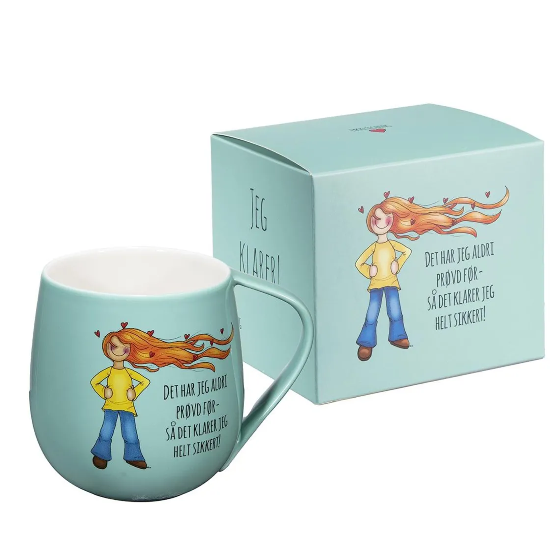 Gjør kaffestunden ekstra hyggelig med denne sjarmerende koppen fra Lykketegning! Koppen har en herlig pastellfarge og et inspirerende motiv som sprer glede. Med et koselig budskap og en morsom illustrasjon, blir den en perfekt gave til deg selv eller noen du er glad i. Laget for å lyse opp dagen din – uansett om det er morgenkaffen eller en rolig tekopp på kvelden.