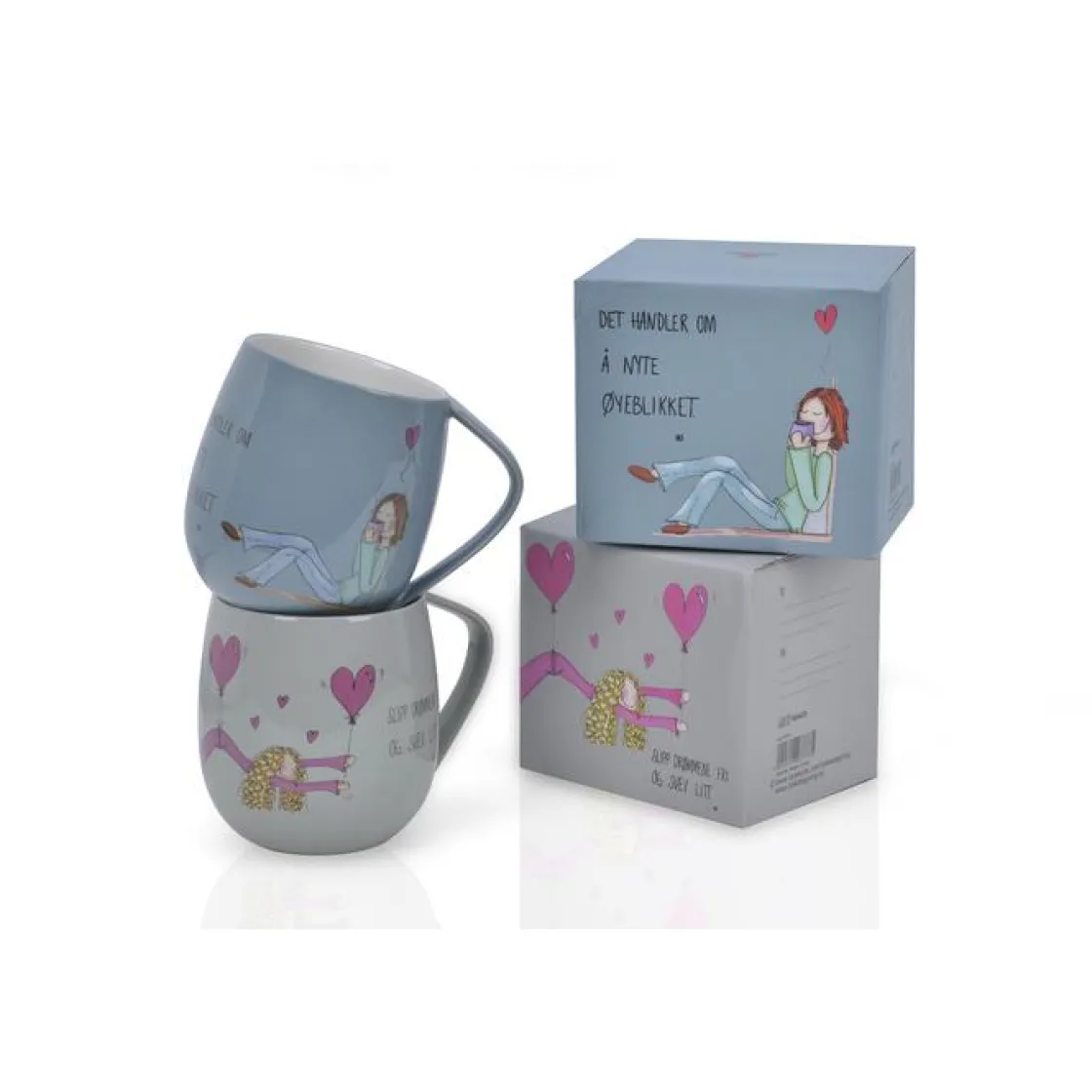 Ta en velfortjent pause med denne herlige Lykketegning-koppen! Med den beroligende blå fargen, teksten «Det handler om å nyte øyeblikket», og en sjarmerende illustrasjon av en avslappet kaffenyter, inviterer denne koppen til ro og velvære. Den avrundede formen ligger godt i hånden. Perfekt for deg som vil skape små, verdifulle pusterom i hverdagen – eller som en tankefull gave til en venn som trenger en påminnelse om å nyte livet.
