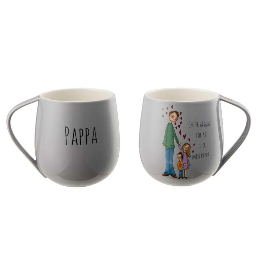 Lykketegning pappa krus i grått, med teksten «jeg er så glad for at du er min pappa». Kruset har en diameter på 9 cm, er 10 cm høyt og har en kapasitet på 40 cl. Det er laget av porselen og tåler oppvaskmaskin. Hvert krus leveres i en fin gaveeske.