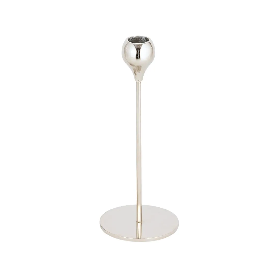 Kronelysestaken har et slankt stativ med blank overflate og en tulipanformet topp som gir plass til et klassisk kronelys. Den står stødig og passer godt både på dekket bord og i en vinduskarm.