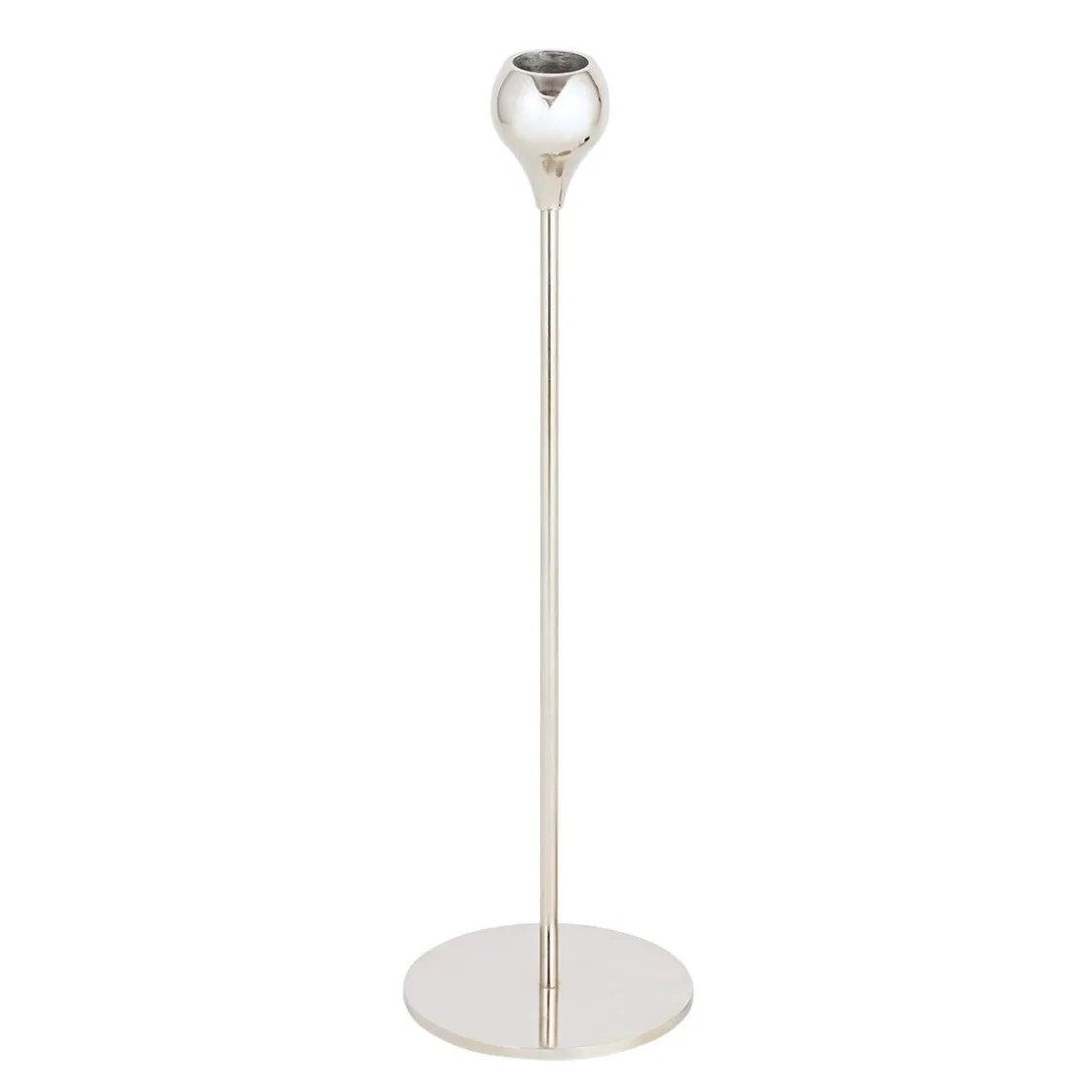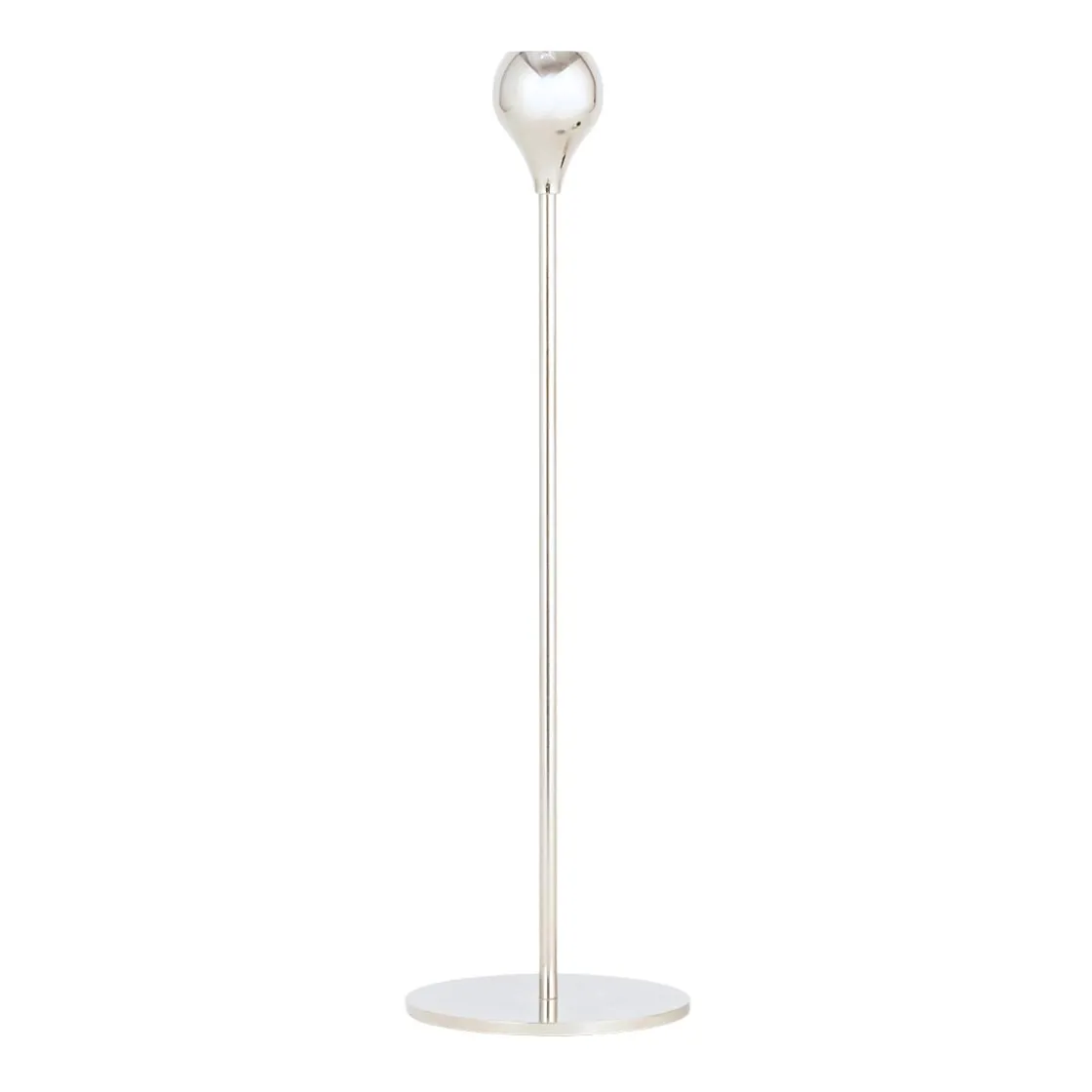 Lang og nett lysestake med tulipanformet topp som løfter kronelyset høyt over bordflaten. Den blanke overflaten fanger lyset fint og gjør seg godt i kombinasjon med andre metalliske detaljer eller klart glass. Passer både alene og sammen med