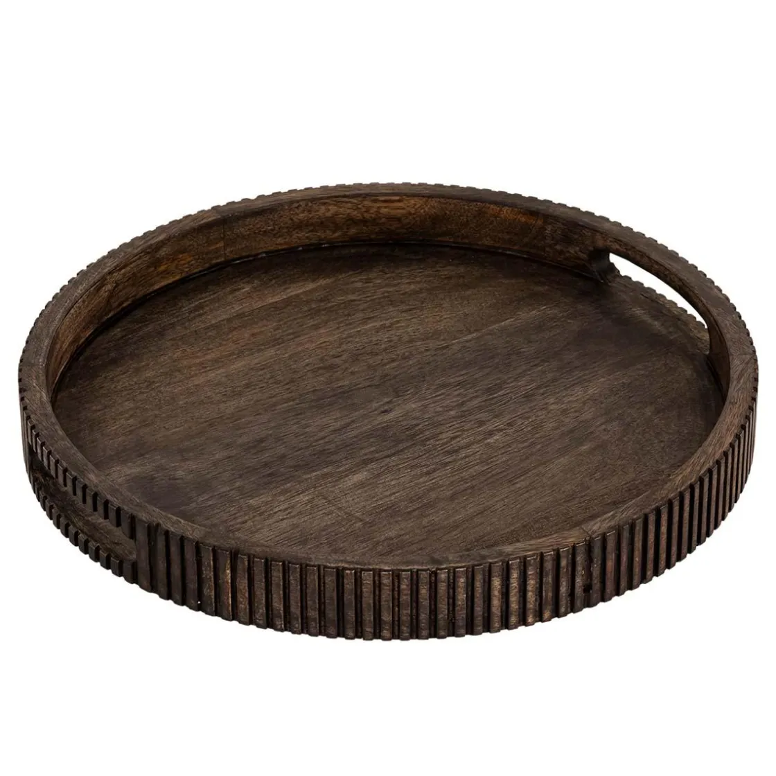 Rundt lysfat i mørkt tre med rillede kanter og utskårne håndtak. En fin base for levende , små eller i flere høyder. Passer godt på spisebordet, et sidebord eller på en puff som trenger litt struktur.