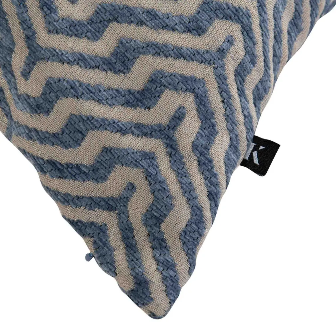 Putetrekket med geometrisk mønster i blå og beige toner gir et moderne og friskt uttrykk til stuen. Den teksturerte overflaten skaper en dynamisk kontrast, perfekt for å balansere med enklere eller ensfargede putetrekk. For en komplett sofakrok kan du kombinere med myke fløyelsputer eller nøytrale linputer som rammer inn mønsteret på en elegant måte. Legg til et og noen e for en stemningsfull atmosfære.