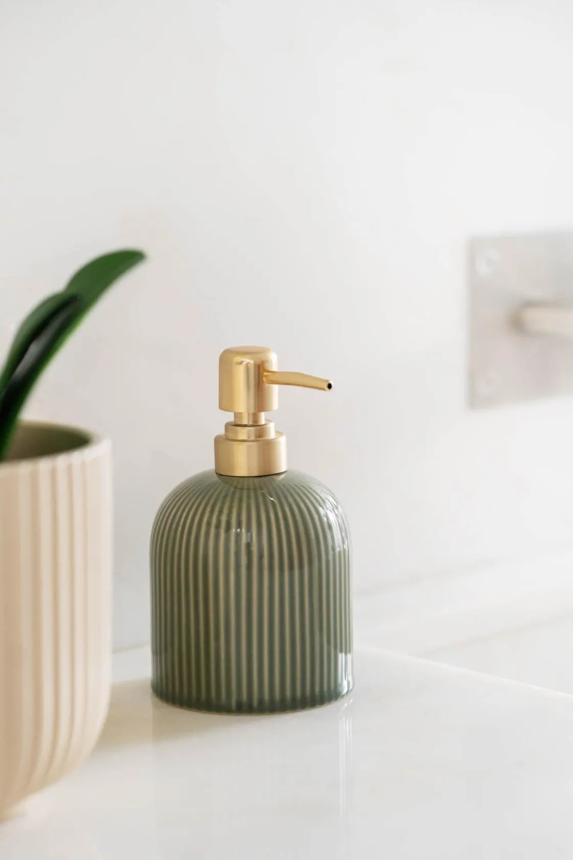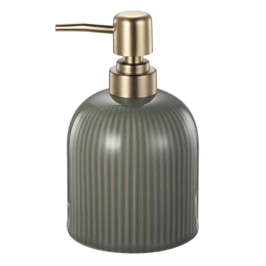 Såpedispenseren i dyp grønn farge og med subtile striper tilfører et rolig preg til baderommet. Pumpen gir en luksuriøs kontrast og gjør dispenseren både praktisk og dekorativ. Perfekt til håndsåpe eller lotion, samtidig som den matcher med andre baderomsartikler i samme serie. Kombiner med en tannbørsteholder eller en kurv for et helhetlig uttrykk.
