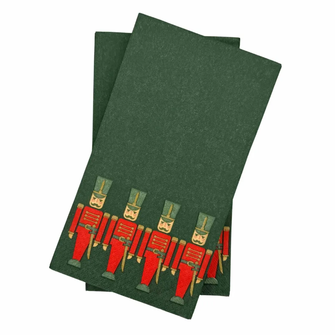 Disse papirserviettene har et sjarmerende design med marsjerende tinnsoldater på en dyp grønn bakgrunn. De passer fint til juledekkingen eller vinterens festlige anledninger.