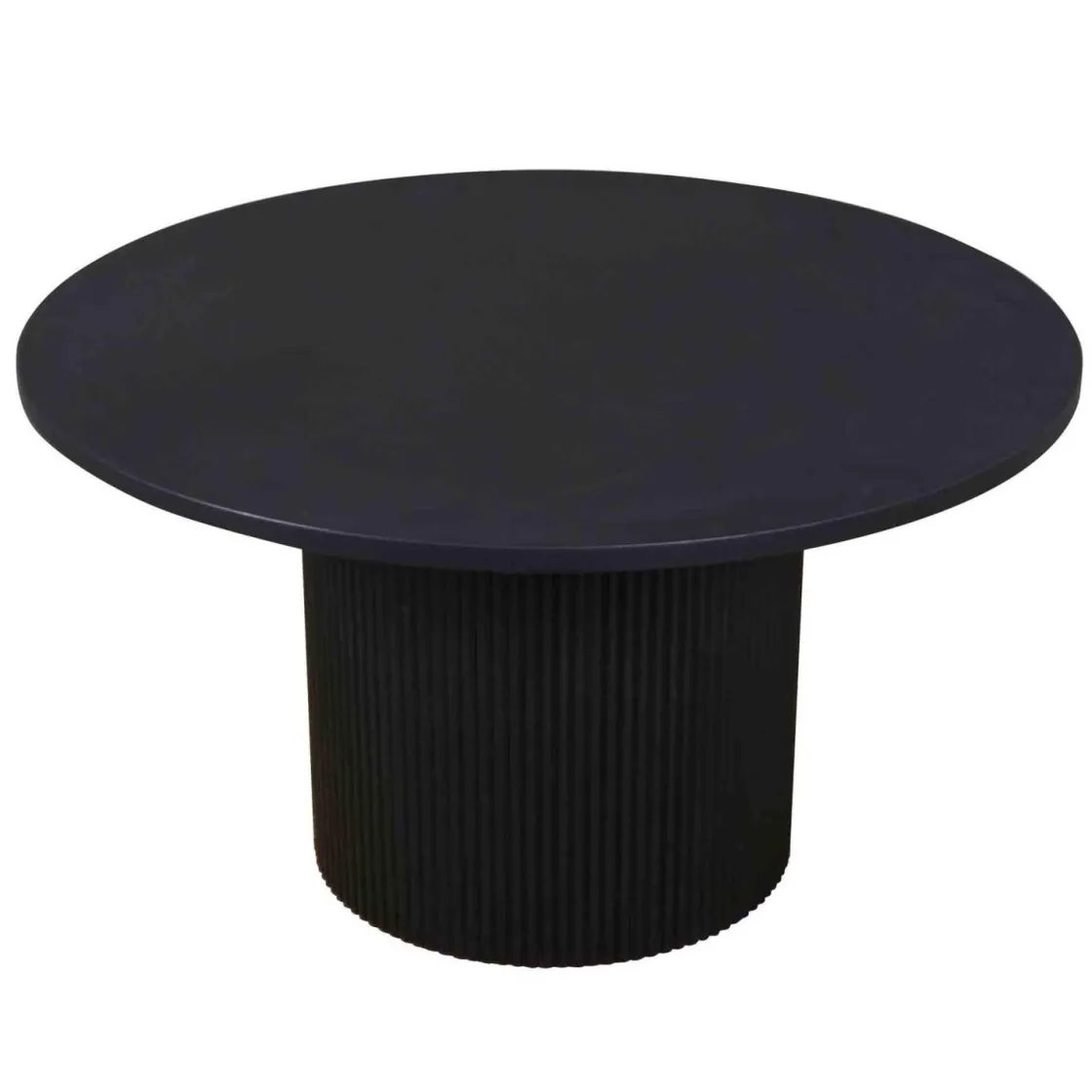 Sort, rundt sofabord med en solid, rund base. Staver rundt basen skaper en rillet struktur. Dette bordet passer til de fleste sofaer og gir stuen din et stilig uttrykk.