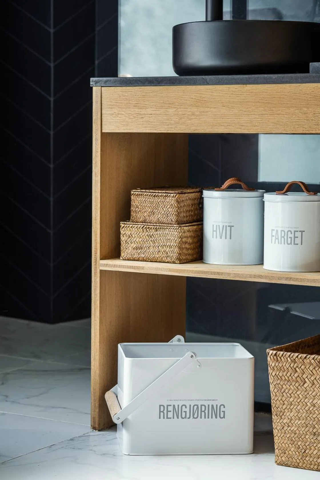Praktisk vaskepulverboks i tidløst design. Den runde formen er tidsaktuell og lærhåndtakene gir boksen det lille ekstra. Finnes for også.